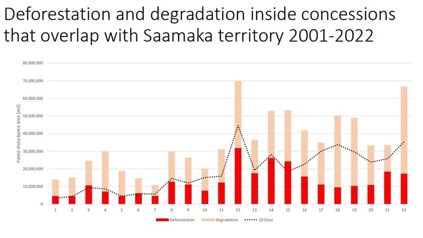 However, despite the victorious Saamaka judgement, the Government of Suriname continues to push forward extractive developments in our lands, violating the court’s ruling. Seventeen years have passed, but the judgement has yet to be fully implemented. Worryingly, deforestation and forest degradation have actually increased since 2007 (see Figure 2). In 2022, we saw a dramatic increase in deforestation coinciding with increased logging operations authorized by the government. This is why the Saamaka Toko—the battle to secure and protect our lands and ancestral ownership rights—is far from over.