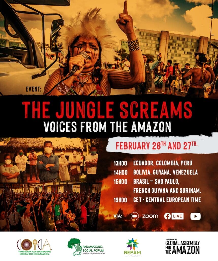 “The Jungle Screams: Voices of the Amazon” will take place this February 26th and 27th at 13:00 of Ecuador, Colombia and Peru; 14:00 of Bolivia, Guyana and Venezuela; 15:00 of Brazil-São Paulo, French Guyana y Surinam; and 19:00 – Central Europe Time.