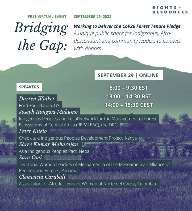 On September 29, 2022, RRI and the Donor Working Group hosted a virtual discussion between Indigenous Peoples and local communities and the donors of a historic $1.7 billion Pledge made in 2021 at CoP26 to support these groups. This dialogue provided a unique opportunity for Indigenous and local community members to connect directly with the Pledge donors, and receive updates and answers to their questions about the commitment.