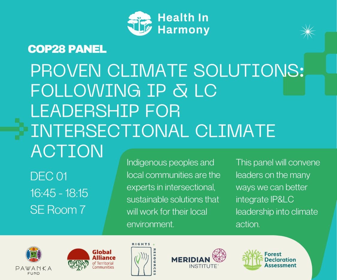 INFO: Indigenous Peoples and Local Communities are the experts in intersectional, sustainable solutions that will work for their local environment. This panel will convene leaders from major institutions and IP&LC representatives to discuss how to integrate IP&LC leadership into climate action. The event is co-organized by Health in Harmony, RRI, Indigenous Information Network (IIN), and Meridian Institute.
