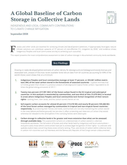 If properly leveraged, natural climate solutions can contribute over 37% of cost-effective CO2 mitigation by 2030. Evidence shows Indigenous Peoples and local communities are key to achieving such outcomes. This report presents the most comprehensive assessment to date of carbon storage in documented community lands worldwide.