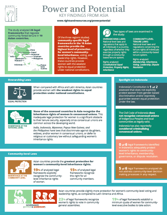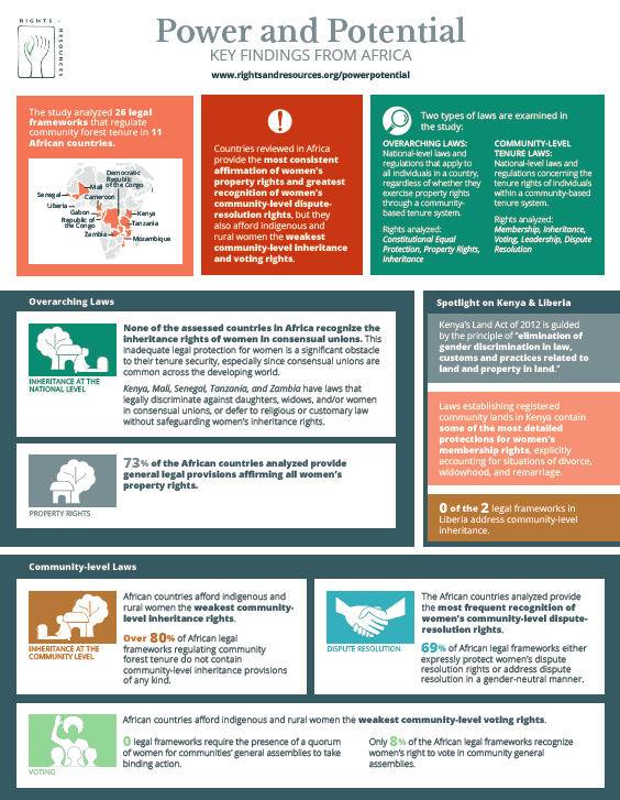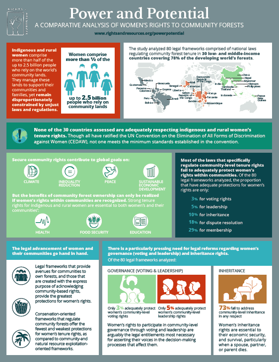 Up to 2.5 billion people hold and use the world’s community lands, yet the tenure rights of women—who comprise more than half the population of the world’s Indigenous Peoples and local communities—are seldom acknowledged or protected by national laws. Although gender norms and women’s forest tenure security vary widely across community-based tenure systems, this analysis concludes that national laws and regulations on the rights of indigenous and rural women to inheritance, community membership, community-level governance, and community-level dispute resolution are consistently unjust, falling far below the requirements of international law and related standards.